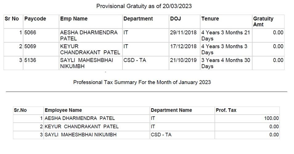 Professional Tax (PT): Calculates and manages Professional Tax as per state regulations.